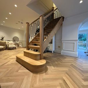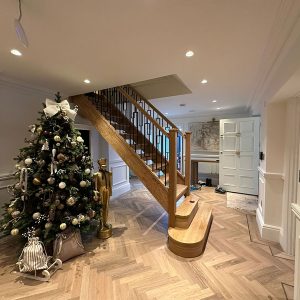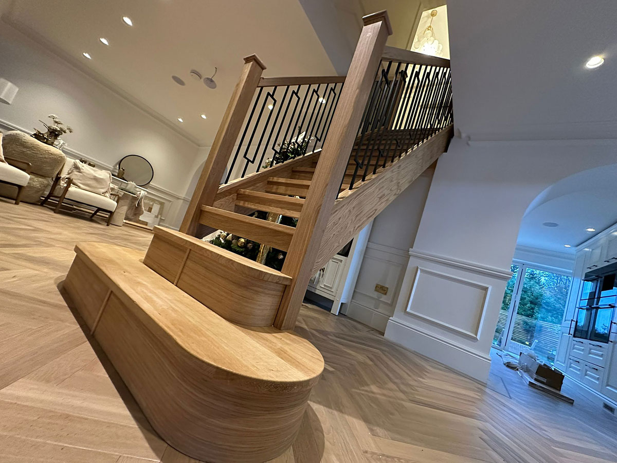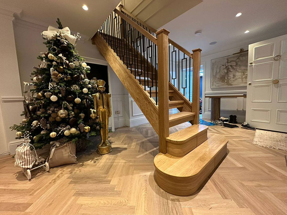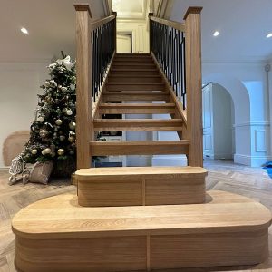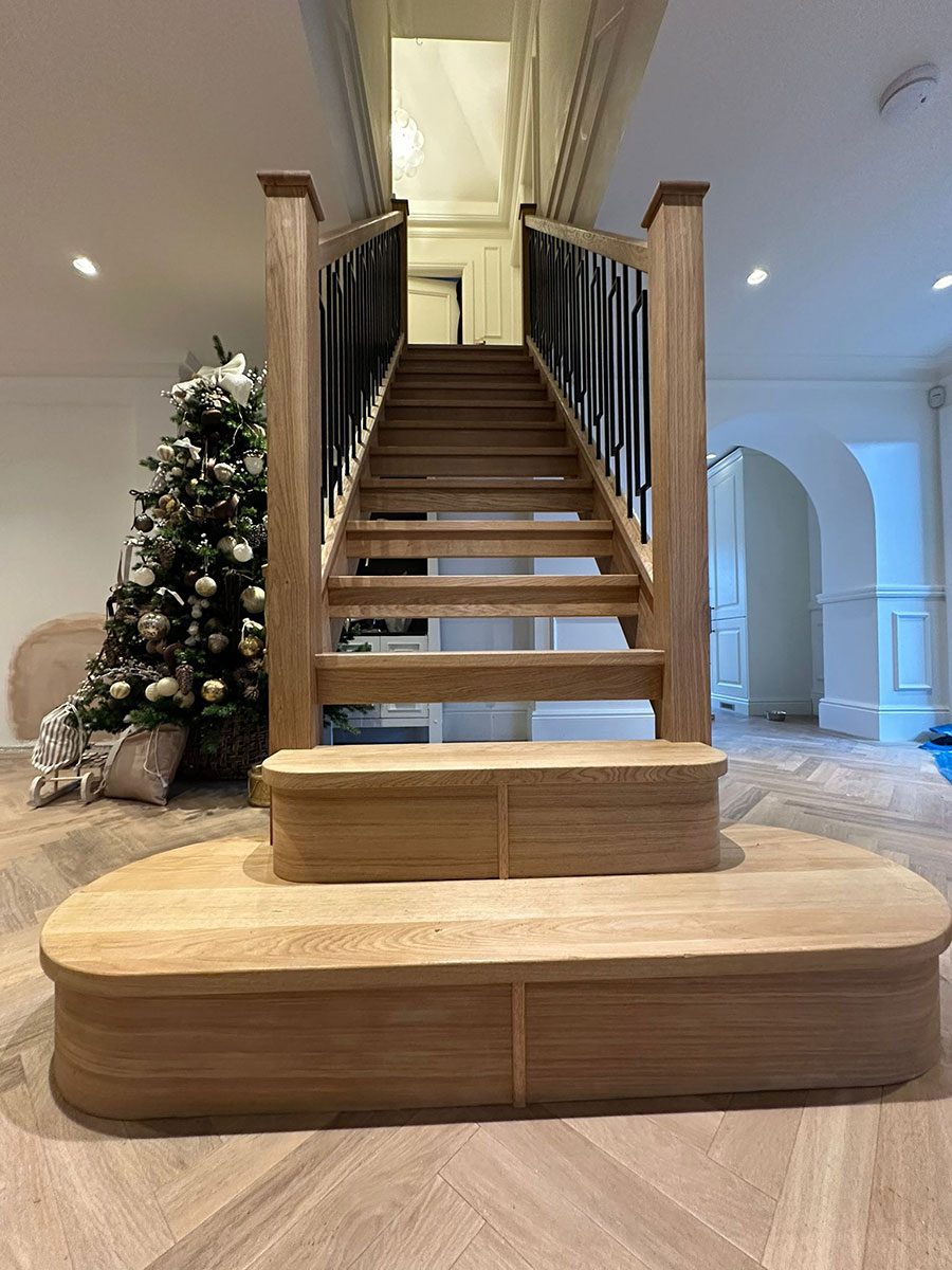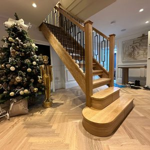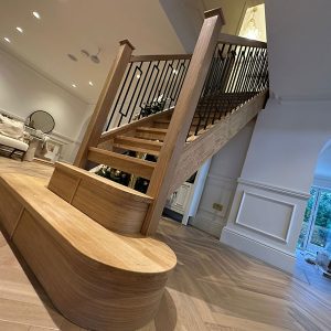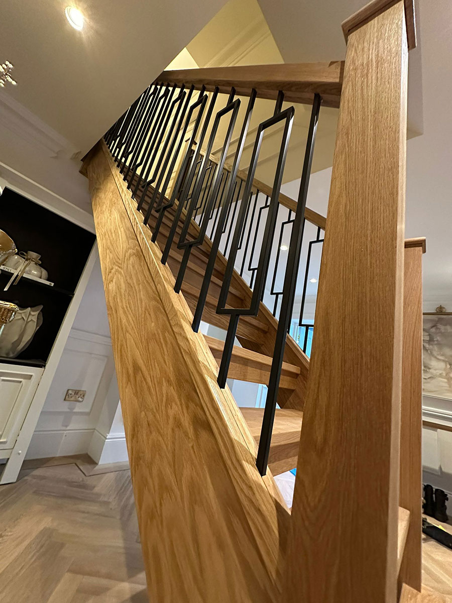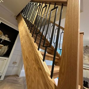 This oak and black metal staircase renovation in Shirley, Solihull, is a striking example of how bespoke carpentry can completely change the look and feel of a home. For this project, Damson Carpentry designed and installed a brand new oak staircase with open treads, creating a modern, open feel while still adding warmth through the natural timber. The addition of a bottom curtain step provides a smooth, elegant transition at the base of the staircase and enhances the overall flow of the space.